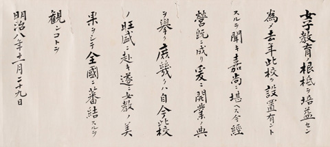 女子教育ノ根柢ヲ培益セン為メ去年此校ヲ設置有ントスルヲ聞キ嘉尚ニ堪ヘス今経営既ニ成リ爰ニ開業ノ典ヲ挙ク庶幾クハ自今此校ノ旺盛ニ赴キ遂ニ女教ノ美果ヲシテ全国ニ蕃結スルヲ観ンコトヲ明治八年十一月二十九日